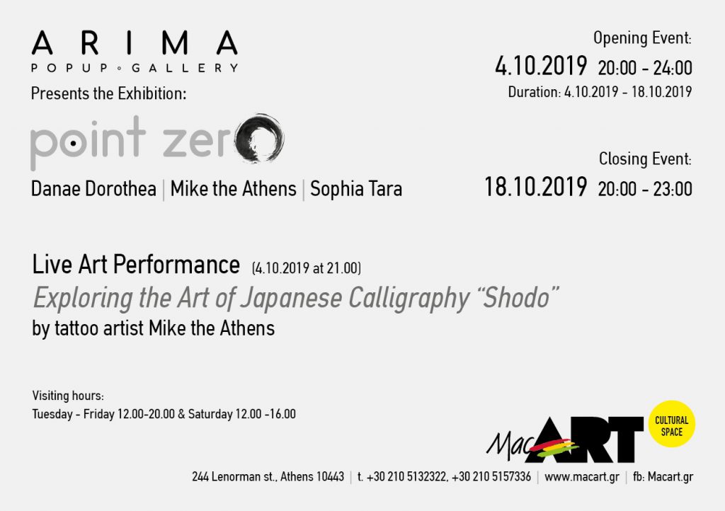 Η πρώτη της εμφάνιση στην Αθήνα, λαμβάνει χώρα στον Πολιτιστικό Χώρο της Macart, όπου η Arima Pop Up Gallery συστήνεται στο κοινό με την έκθεση «Point Zero».